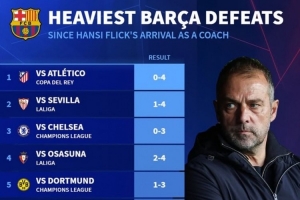 24直播网02月13日讯 巴萨在国王杯半决赛首回合0-4惨败马竞,创下弗里克执教时期的最大比分失利。据统计,弗里克时代巴萨多次遭遇大比分输球,包括0-3切尔西、1-4塞维利亚等,球队近期防守问题严重。