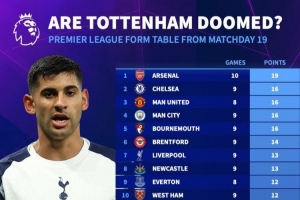 体育资讯2月23日讯 德国转会市场统计了英超各队第19轮比赛以来拿到的积分,并列出榜单,阿森纳19分最多,热刺4分垫底。