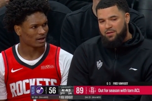 目前比赛进行到第三节,已经因膝伤赛季报销的火箭当家控卫范弗里特出现在替补席与阿门交流,后者本场比赛三节不到已经出现6次失误,而火箭全队更是已经出现了多达19次失误。