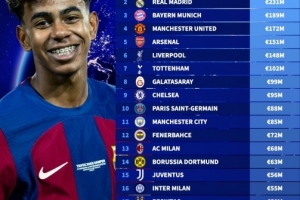 24直播网02月28日讯 德国转会市场盘点2025年球衣销售收入,巴萨以2.77亿欧元居首,皇马2.31亿欧元次席,足坛仅两家超两亿欧。拜仁、曼联、阿森纳、利物浦分列三至六位。