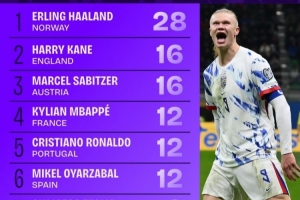 世欧预射正榜:哈兰德28次独自领跑,凯恩16次、姆巴佩C罗各12次