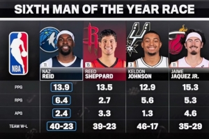 纳兹·里德 球队战绩40胜23负 场均13.9分6.4篮板2.4助攻