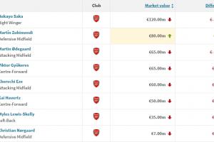 24直播网03月09日讯 德转更新英超身价,领头羊阿森纳仅苏维门迪一人身价上涨500万至8000万。其余球员如萨卡、厄德高等多人身价下跌,总计跌幅超3700万。