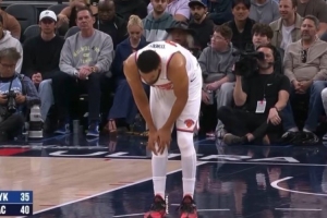 GIF-唐斯顺下接球大踏步上进,落地后一直捂着膝盖,有点不适