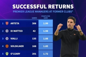 24直播网11月21日讯 德国转会市场统计了教练执教球员时代英超老东家的场均积分。阿尔特塔以1.99分高居榜首,迪马特奥以1.98分紧随其后。维亚利、索尔斯克亚等前球员教练也榜上有名,该榜单衡量了他们对老东家的执教表现。