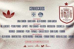 24直播网03月20日讯 西班牙国家队公布27人名单,巴萨7人入选居首,皇马仅1人。球队将于3月28日对阵塞尔维亚,3月31日战埃及,进行两场热身赛。