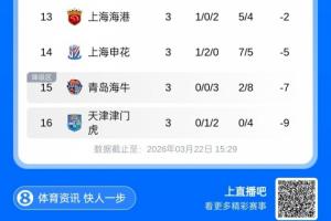 体育资讯03月22日讯 2026赛季中超第3轮比赛全部完赛,3轮过后仍有国安、海港、申花等6队负分,其中2队仍0胜。
