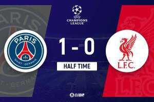 半场-巴黎暂1-0利物浦 杜埃兜射破门利物浦半场仅1次射门0射正