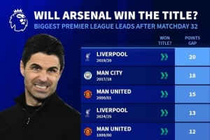 24直播网04月11日讯 阿森纳英超爆冷负伯恩茅斯,仍领先曼城9分。数据显示,英超32轮后至少领先8分的球队此前均夺冠。但曼城少赛2场,冠军悬念犹存。