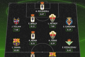 24直播网04月14日讯 西甲第31轮最佳阵容出炉,巴萨新星亚马尔以满分10分领衔。入选球员包括皇家奥维耶多的门将埃斯坎德尔、拜利,以及费兰等。该阵容由数据网站Whoscored根据球员表现评选而出,展现了本轮比赛的顶级表现。