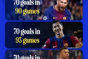 CBS体育晒图,统计打进欧冠70球的球员用时场次。其中梅西90场70球历史最快,莱万93场70球第二,姆巴佩98场70球第三。