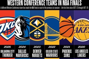 体育资讯4月17日讯 NBA官方今天分享了一个数据:过去六个赛季,每年都有不同的西部球队闯入NBA总决赛。这是1972-73赛季至1977-78赛季以来首次出现如此局面。