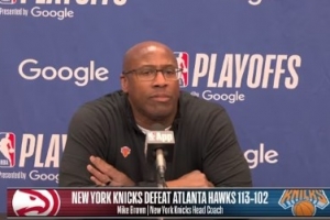 迈克·布朗:“我们的伙计们……第一场比赛,显然这是一场充满身体对抗的比赛。你必须对亚特兰大给予很高的评价,他们给比赛带来了你希望在这个时候看到的身体对抗级别。我必须赞扬我们的球员,我们赛前讨论过的一件事就是要努力保护防守篮板,不让他们抢到进攻篮板,我们的球员在这方面做得很好。亚特兰大这支球队只抢到了8个进攻篮板,对我们来说是个好结果。所以,当他们投篮时,我们要努力去卡位找人,这是我们必须继续坚持的。在转换进攻中,他们上半场得到了一些机会,按照我们的统计,他们有18分快攻得分。我们在半场休息时讨论了这个问题,我们在下半场做得好了一点,直到最后几分钟,在最后五六分钟里我们让对手投进了几个追身三分。但总体来说,下半场我们的退防做得不错,我们需要在那里继续进步。他们的小个子挡拆也是个问题,我们的球员在下半场以正确的方式防守挡拆做得相当好,比赛初段这方面我们有些失控,让他们得到了一些空位机会。但在下半场,我们在不犯规的前提下展现出的对抗级别非常棒,在防守他们小个挡拆时的沟通也很好。我们必须推反击,打出转换进攻,这一点我们做得相当不错。我们还可以更早地进入我们的战术发起状态,我们要更快地推进过半场,更早地进入战术,这样我们就不用总是面对落好位的防守,不用总是把24秒耗尽。我们在冲抢进攻篮板方面还可以做得更好一些,我们抢了6个进攻篮板,转化成了13分二次进攻得分,这很不错,但我们或许还能抢得更多。再说一次,你得赞赏亚特兰大他们在卡位方面的表现。然后,我们的不同球员在不同时刻站了出来,这就是季后赛的意义,每个人都挺身而出做出贡献。阿努诺比投进了一些关键球,哈特抢了14个篮板,拿下了两双,这太棒了。唐斯为我们投进了一些及时的进球,布里奇斯的防守很出色。布伦森对我们来说表现很好,特别是在比赛初段我们需要打开局面的时候。甚至克拉克森在他替补登场的11分半钟里也表现出色。所以这是伙计们带来的一场漂亮的胜利。”