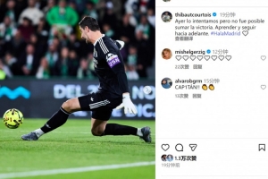 皇马门将库尔图瓦社媒晒出比赛照片,配文:“昨天我们拼尽全力,但未能赢得胜利,我们会吸取教训,继续前进。”