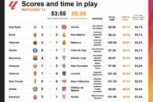 西甲第13轮净时间:埃尔切vs皇马58分8秒,巴萨vs毕巴53分44秒