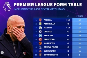 英超近7轮积分榜:阿森纳19分领跑,利物浦3分垫底次席