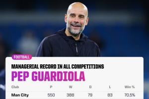 执教生涯1000场比赛,瓜迪奥拉取得了716胜156平128负的战绩,胜率超过7成。