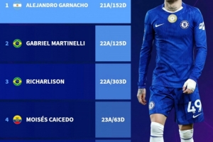 体育资讯12月2日讯 德国转会市场统计了南美球员出战100场英超比赛的年龄,并列出最年轻球员排名,加纳乔居首。