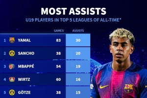 24直播网12月02日讯 德国转会市场统计了五大联赛U19球员的助攻榜。亚马尔以83场30助高居榜首,展现惊人创造力。桑乔(38场20助)、姆巴佩(54场19助)紧随其后,维尔茨、格策等名将也榜上有名,该榜单反映了年轻天才的传球才华。
