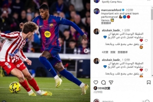 拉什福德社媒晒出比赛照片,并写道:“重要的胜利,出色的团队表现。加油!”
