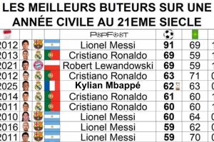 姆巴佩今年还剩4场比赛,仍有希望冲击2013年C罗的69球、2021年莱万的69球和2012年C罗的63球。但在这份榜单上,2012年梅西的91球仍遥不可及。