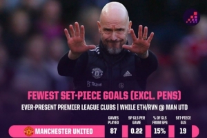 滕哈赫共率曼联踢了87场英超比赛,通过定位球打进19球,平均每场0.22球,定位球进球占球队总进球数仅为15%。本赛季,曼联13轮英超比赛已经通过定位球打进10球,和踢了14轮的阿森纳持平。曼联本赛季场均可通过定位球打进0.77球,定位球进球数占球队总进球数的47.6%。