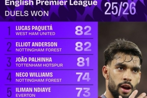 本赛季英超成功对抗榜:帕奎塔、安德森、帕利尼亚分列前三
