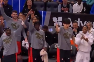 首节比赛,开拓者中锋罗伯特·威廉姆斯飚中生涯第二记三分,杨瀚森与替补席的队友们开心庆祝。