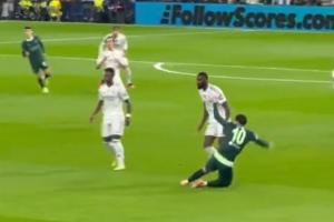 在一次攻防转换回合中,谢尔基拿球先是晃过了巴尔韦德的铲抢,随后将球分出,然而回防的吕迪格一把将其撞倒在地,谢尔基躺在地上摊手一脸困惑。