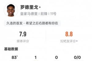 24直播网12月15日讯 12月15日,皇马在西甲对阵阿拉维斯,罗德里戈首发贡献1球。他送出30次传球,成功率高达96.7%,并有1次成功过人。尽管射门3次仅1次射正,但全面的数据帮助球队取胜,个人评分7.9分。