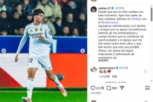 24直播网12月15日讯 皇马小将巴尔德佩尼亚斯分享其西甲首秀喜悦。他称这是自童年起的梦想,感谢家人、朋友及教练团队的信任与支持。他渴望继续进步,享受更多赛场时刻。