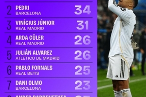24直播网12月17日讯 西甲运动战机会榜出炉,姆巴佩以47次机会高居榜首,佩德里、维尼修斯分列二、三位。皇马与巴萨球员包揽前四,居莱尔、阿尔瓦雷斯并列第四。该榜单凸显了西甲年轻攻击手的超强创造力和进攻威胁。
