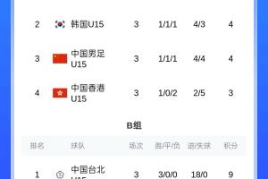 积分榜方面,U15中国队与韩国U15同积4分,相互战绩一致,小组净胜球落后对手1球,最终排名第三收官。