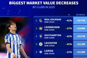 2025年球队身价缩水榜:皇家社会-1.77亿,勒沃库森-1.64亿,莱比锡与曼联在列