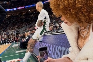 库兹马女友、知名模特Winnie Harlow也出现在场边观战,还时不时拿出手机给场上的库兹马拍照。她在赛后更新社媒,晒出了观赛的照片,并写道:“在恋爱里上头了。”