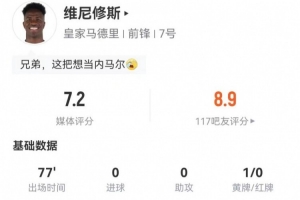 体育资讯1月5日讯 皇马在本轮西甲对阵贝蒂斯,维尼修斯本场数据如下:
