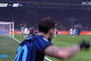 比赛第48分钟,恰尔汗奥卢开出左侧角球,劳塔罗抢点头球破门!