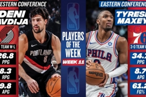 体育资讯1月6日讯 今日NBA官方宣布,开拓者球星阿夫迪亚和76球星马克西分别当选本赛季第11周西部和东部周最佳球员。