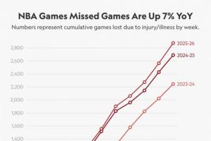 本赛季至今因伤缺席共2875场,比上赛季同期多7%,比上上赛季同期多28%