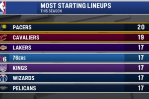 体育资讯1月7日讯 今日,骑士比赛转播商晒出了本赛季至今使用最多套不同首发阵容的球队排名: