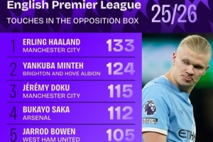 本赛季英超对方禁区触球榜: