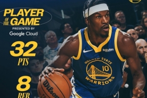 赛后,勇士官方发布本场最佳数据海报:吉米·巴特勒当选。