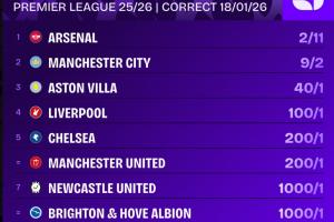 24直播网01月19日讯 英超第21轮,维拉0-1负于埃弗顿。阿森纳本轮虽战平,但积分优势扩大至7分,以2/11的夺冠赔率稳居榜首,卫冕形势一片大好。曼城以9/2列第二,其余球队赔率均遥遥领先,争冠悬念已基本聚焦于阿森纳与曼城之间。
