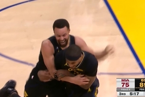 GIF-小佩顿接库里长传上篮取分 后被前者熊抱很开心