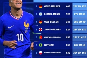 达成职业生涯400球球员年龄:姆巴佩最年轻,梅西第三,C罗第6