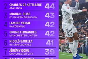 体育资讯1月27日讯 Squawka统计出本赛季欧洲五大联赛运动战创造机会排行榜,皇马当家球星姆巴佩50次位居第一。