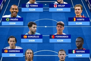 24直播网11月16日讯 《转会市场》统计了从未入选国家队的年轻球员,并组建了一套总身价3.6亿欧元的阵容。该队多名豪门球员在列,包括前锋齐马斯、德拉普,中场派尚、尼科·冈萨雷斯等,以及后卫约罗、卡拉雷斯等。