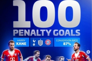 德转数据统计显示,凯恩也就此达成了俱乐部+国家队生涯点球100球里程碑,命中率为87%。